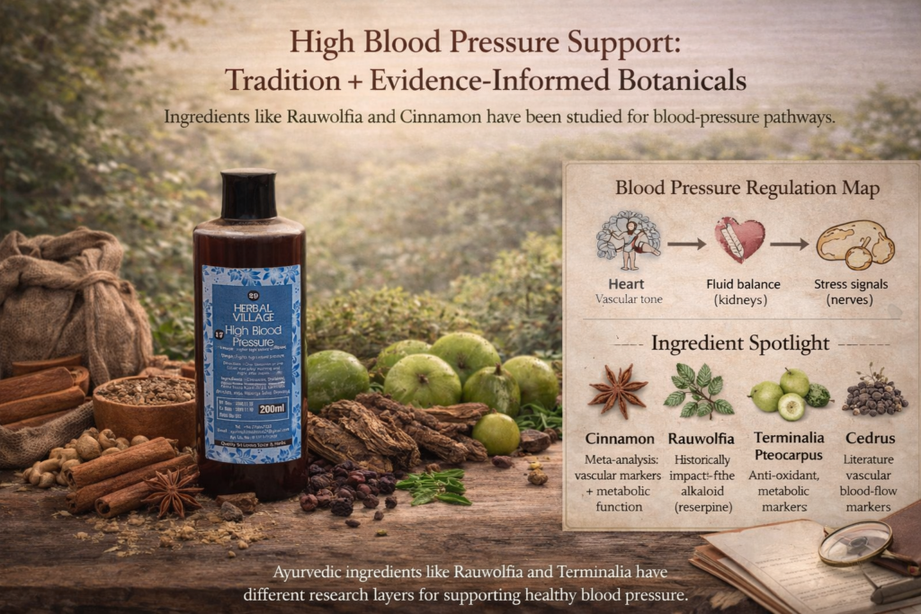 High blood pressure (hypertension) is influenced by several systems at once—vascular tone, nervous system signaling, inflammation/oxidative stress, kidney function, and metabolic health. Lifestyle and medical treatment remain foundational, but certain botanicals have growing research behind them as supportive tools. Herbal Village High Blood Pressure is a Sri Lankan Ayurvedic formula that includes ingredients with both […]